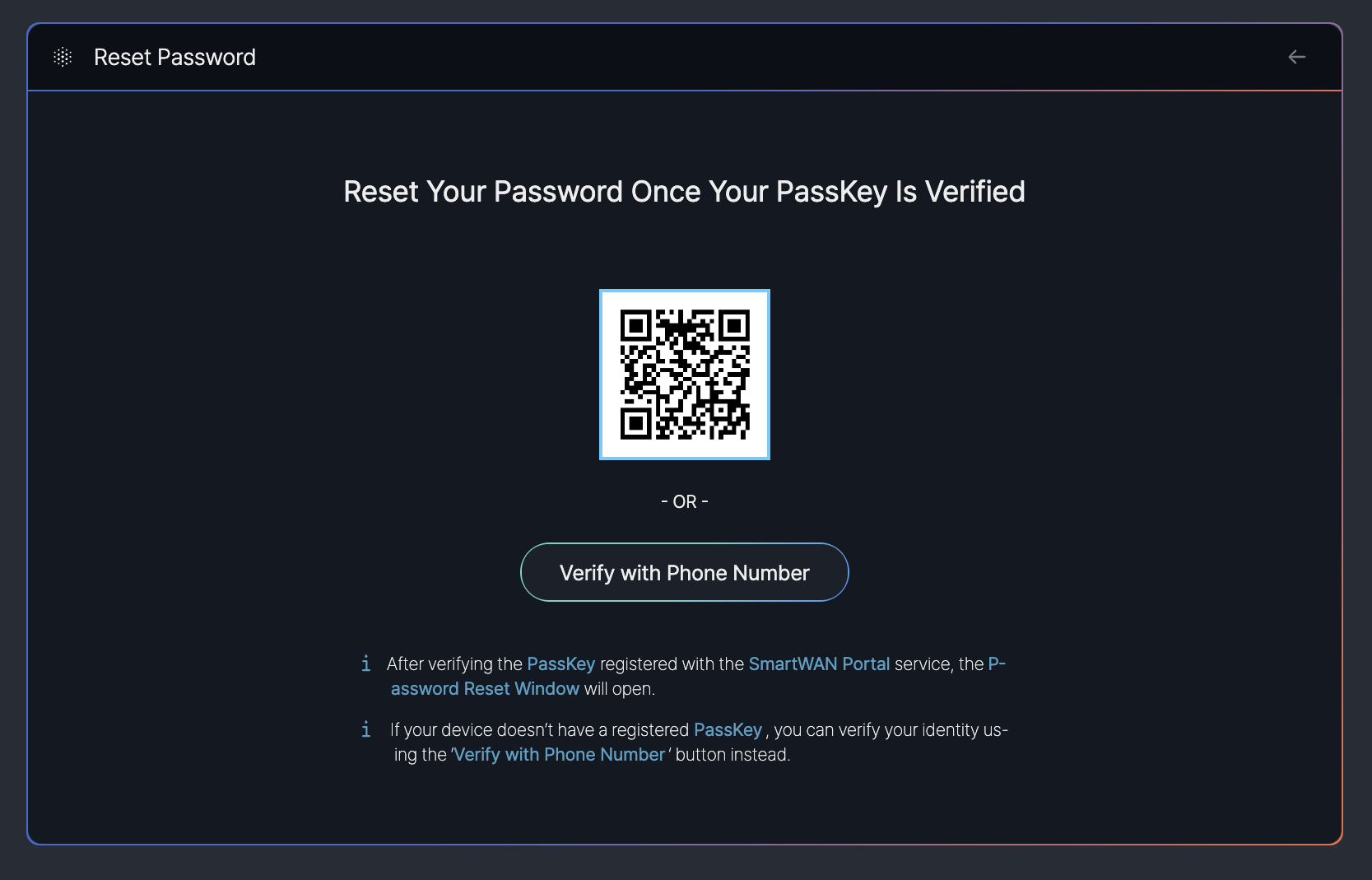 - QR Code: A QR code is displayed for users to scan with a device that has a registered PassKey, enabling secure verification prior to password reset.