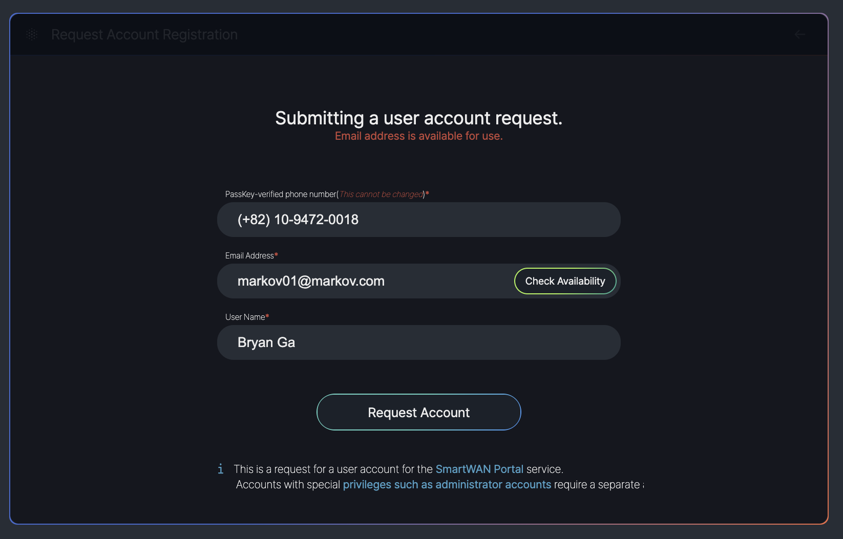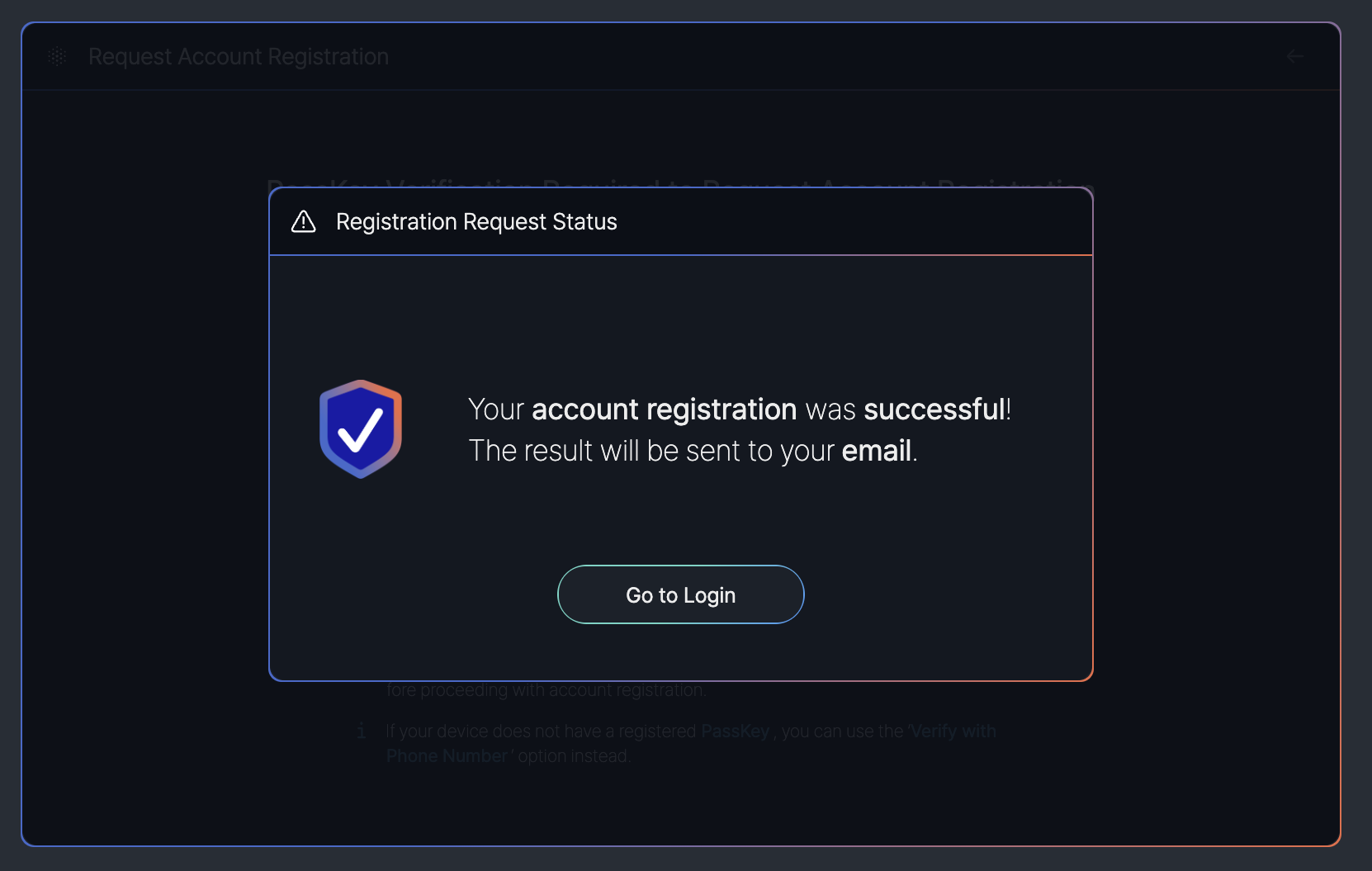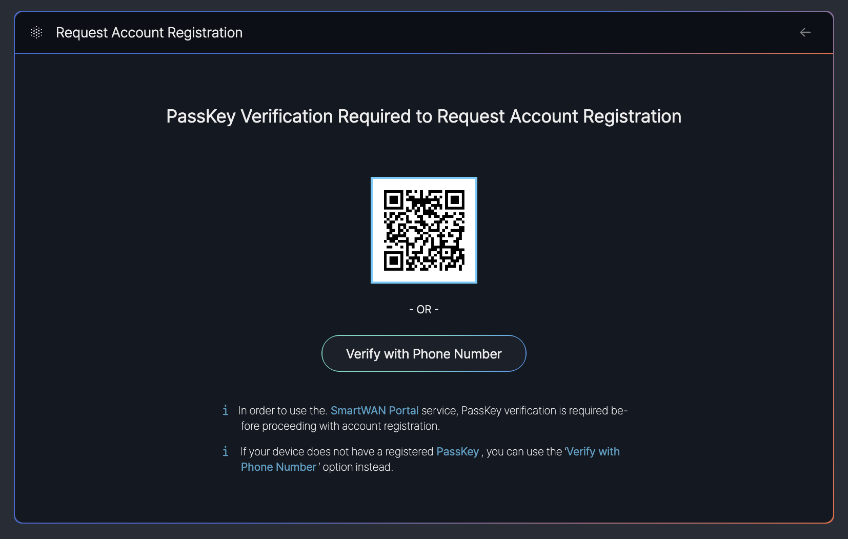 - QR Code: A QR code is displayed for users to scan with a device that has a registered PassKey, enabling secure verification prior to request an account.