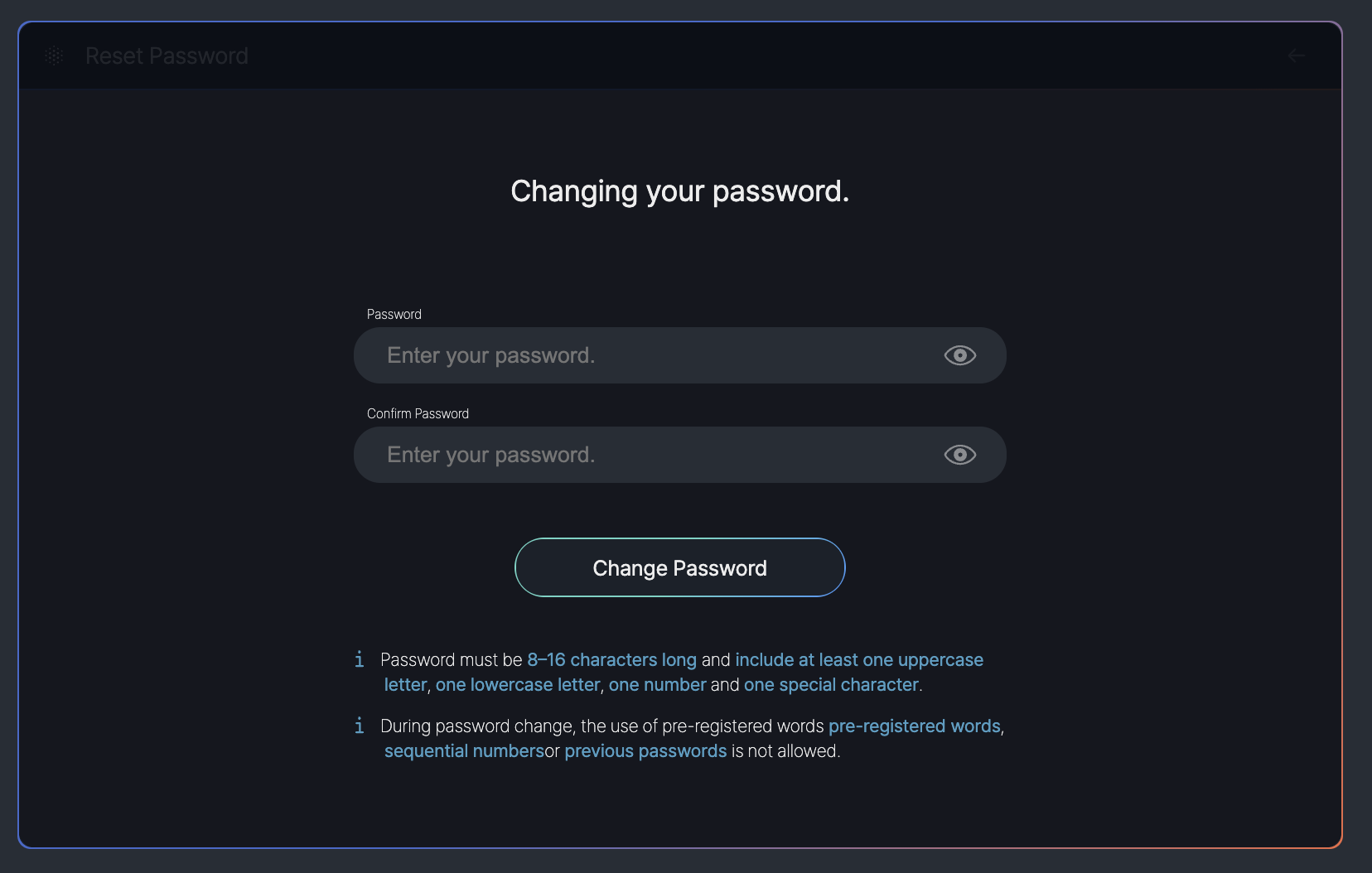- Password: A field for entering the user’s password (e.g., "Enter your password"), with a visibility toggle icon to show or hide the password.