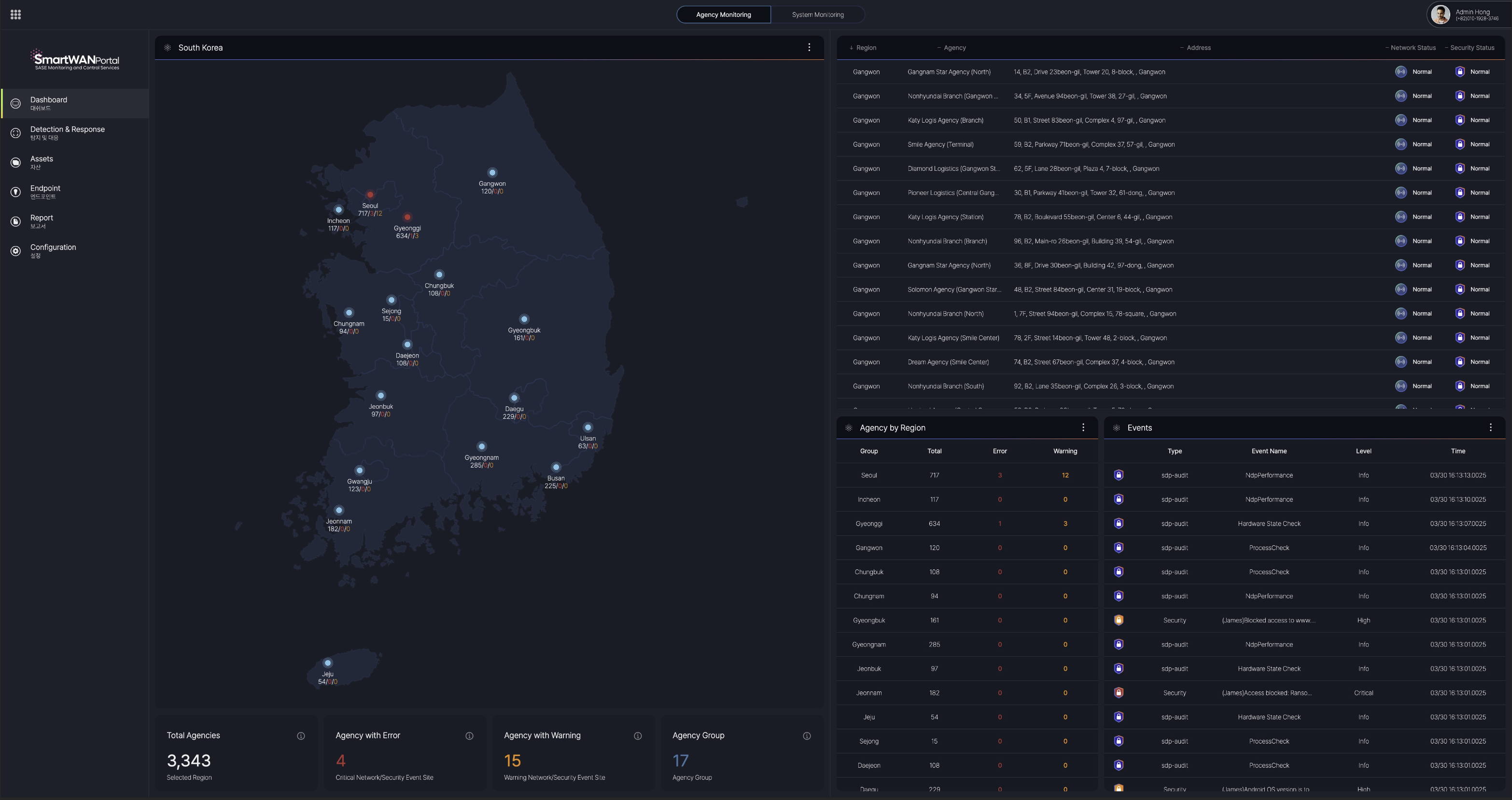 전체 대리점 현황과 주요 도시 별 대리점 정보를 제공하고 현재까지 집계된 네트워크, 보안 이벤트에 대해 4가지 유형(Block, Critical, Minor, Info)으로 분류하여 제공