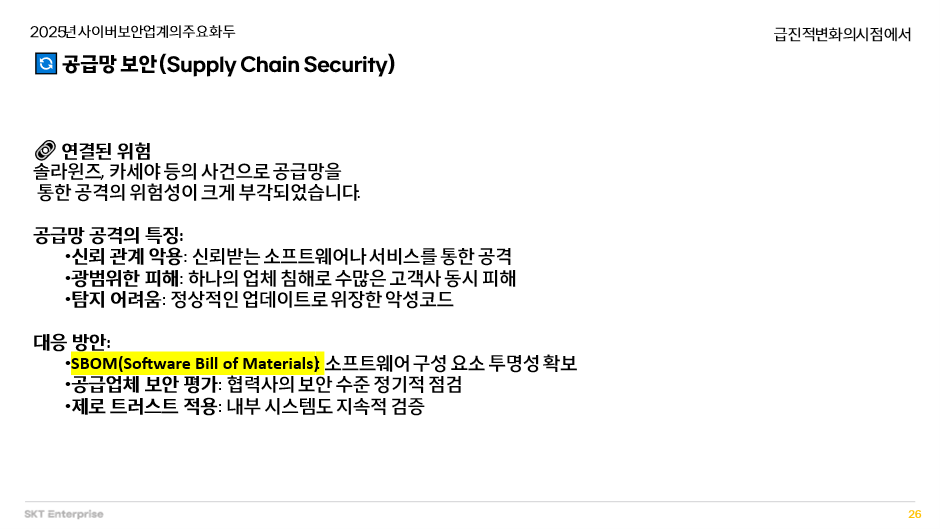 따라서 단일 기업의 보안 노력만으로는 충분하지 않으며, 생태계 전체의 투명성과 신뢰성 확보가 핵심 과제로 떠올랐습니다. 이를 위해 SBOM을 통한 소프트웨어 구성 요소의 가시성 확보, 협력사 보안 수준에 대한 정기적 검증, 그리고 제로 트러스트 원칙에 기반한 지속적 모니터링이 필수적입니다.