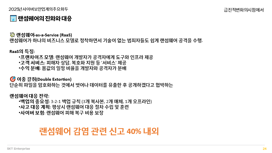 이에 대응하기 위한 기업들의 전략으로는 3-2-1 원칙에 따른 백업, 평상시 랜섬웨어 대응 절차 점검과 훈련, 그리고 사이버 보험이 제시되고 있습니다. 실제로 국내 보안 사고 신고의 40%가 랜섬웨어 감염과 관련된 만큼, 지금은 랜섬웨어에 대한 경각심과 사전 대비가 중요한 시점입니다.