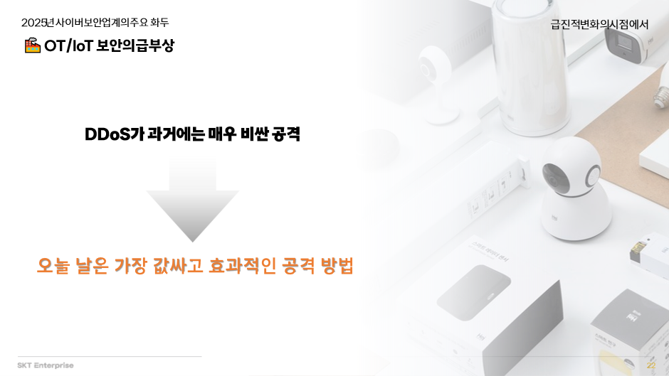 과거에는 대규모 트래픽을 만들어내려면 많은 비용과 자원이 필요했기 때문에 DDoS 공격은 매우 비싼 공격 방식이었습니다. 그러나 오늘날에는 수많은 IoT 기기들이 인터넷에 연결되고, 기본 보안 설정이 취약한 상태로 방치되면서 손쉽게 봇넷(해커가 원격 조종하는 감염 기기들의 네트워크)으로 악용되고 있습니다. 그 결과 DDoS는 가장 저렴하고 효과적인 공격 수단으로 자리잡게 되었습니다.