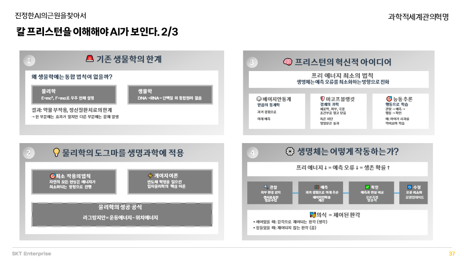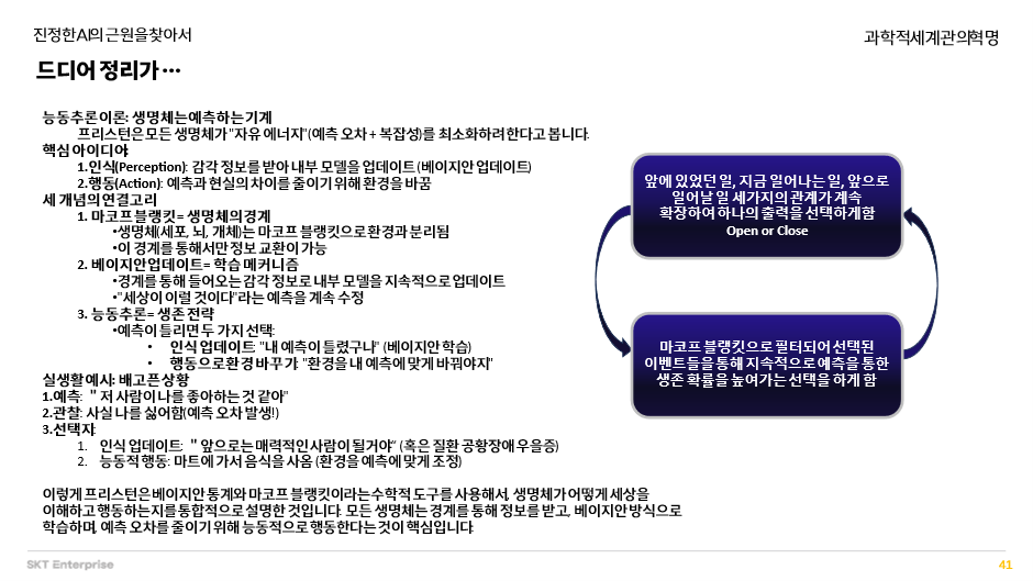 프리스턴이 제시한 프리 에너지 원리는 물리학의 최소 작용 원리를 생명과학에 적용한 개념으로, 생명체가 끊임없이 예측 오류를 최소화하는 방향으로 진화한다는 설명을 제공합니다. 이는 생명체와 인공지능 모두의 작동 원리를 이해할 수 있는 확률적·수학적 기반을 마련했으며, 우리의 의식과 행동 또한 불확실성 속에서 오류를 줄여 나가려는 지속적 과정으로 설명할 수 있게 하였습니다.