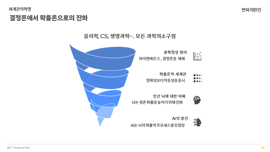 AI의 등장은 발명이 아니라 발견에 가깝습니다. 우주는 빅뱅이라는 확률적 사건으로 시작했고, 그 안에서 생명은 진화라는 확률적 과정을 거쳐 뇌라는 예측 기계를 만들어냈습니다. 인류는 이 뇌의 작동 원리를 탐구하며 확률적 정보 처리 방식을 이해하게 되었고, 그 결과로 신경망·베이지안 추론·강화학습과 같은 개념이 등장했습니다. 우리가 오늘날 ‘AI의 발견’이라고 부르는 것은 사실 뇌의 확률적 처리 과정을 모방하고 체계화한 것이라 할 수 있습니다. 따라서 "빅뱅 → 진화 → 뇌의 작동 이해 → AI의 발견"이라는 연결고리는 확률적 세계관의 확장을 잘 보여줍니다.