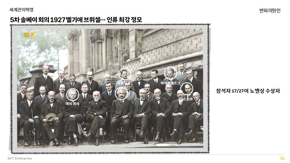 이 사진은 1927년 브뤼셀에서 열린 제5차 솔베이 회의에 참석한 세계 최고 물리학자들의 모습입니다. 주제는 ‘전자와 광자(Electrons and Photons)’였으며, 새롭게 부상한 양자역학을 어떻게 이해할 것인가가 핵심 논의였습니다. 아인슈타인(앞줄 왼쪽 다섯 번째), 마리 퀴리(앞줄 왼쪽 세 번째), 닐스 보어(둘째 줄 맨 오른쪽) 등 당대 거장이 모두 참석했습니다.