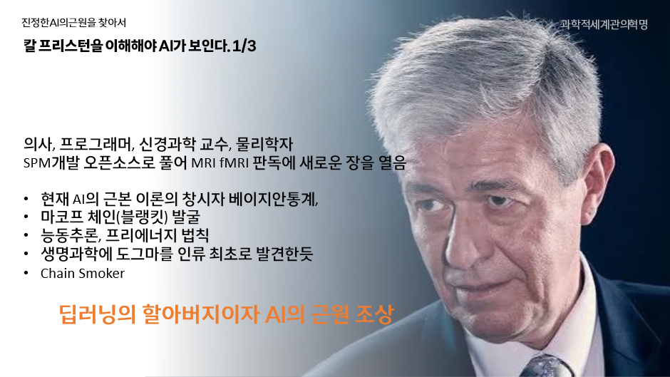 칼 프리스턴은 의학, 신경과학, 물리학을 아우르는 융합적 배경을 바탕으로 뇌 연구와 인공지능 이론에 결정적인 기여를 한 학자입니다. 그는 뇌영상 분석 도구인 SPM을 개발하여 신경과학 연구의 새로운 장을 열었을 뿐만 아니라, 베이지안 통계, 마르코프 체인, 프리 에너지 원리를 정립함으로써 AI의 근본적 사유 체계를 마련하였습니다.