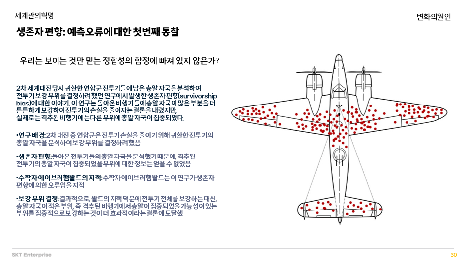 생존자 편향(Survivorship Bias)은 성공 사례나 살아남은 사례만 보고 전체를 판단하는 인지적 오류를 말합니다. 2차 세계대전 당시 귀환한 전투기의 총탄 자국을 기준으로 방어를 강화하려 했지만, 실제로는 총탄을 맞고도 귀환할 수 있었던 부분이 아니라, 맞으면 추락해 돌아오지 못한 취약 부위를 보강해야 했습니다.