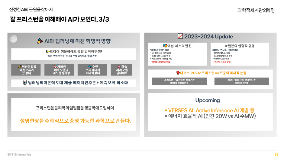 이 원리를 통해 생명현상은 단순한 관찰의 대상이 아니라 물리학처럼 통합된 법칙으로 설명 가능한 과학적 영역으로 확장되었고, 동시에 딥러닝의 철학적·수학적 토대가 확립되었습니다. 최근에는 일본 RIKEN 연구소를 비롯한 다양한 실험이 이를 뒷받침하고 있으며, 나아가 Active Inference 기반 차세대 AI 개발로 이어지고 있습니다. 이러한 흐름은 생명과학과 인공지능 모두에 있어 패러다임 전환을 이끈 혁신적 진보라 할 수 있습니다.